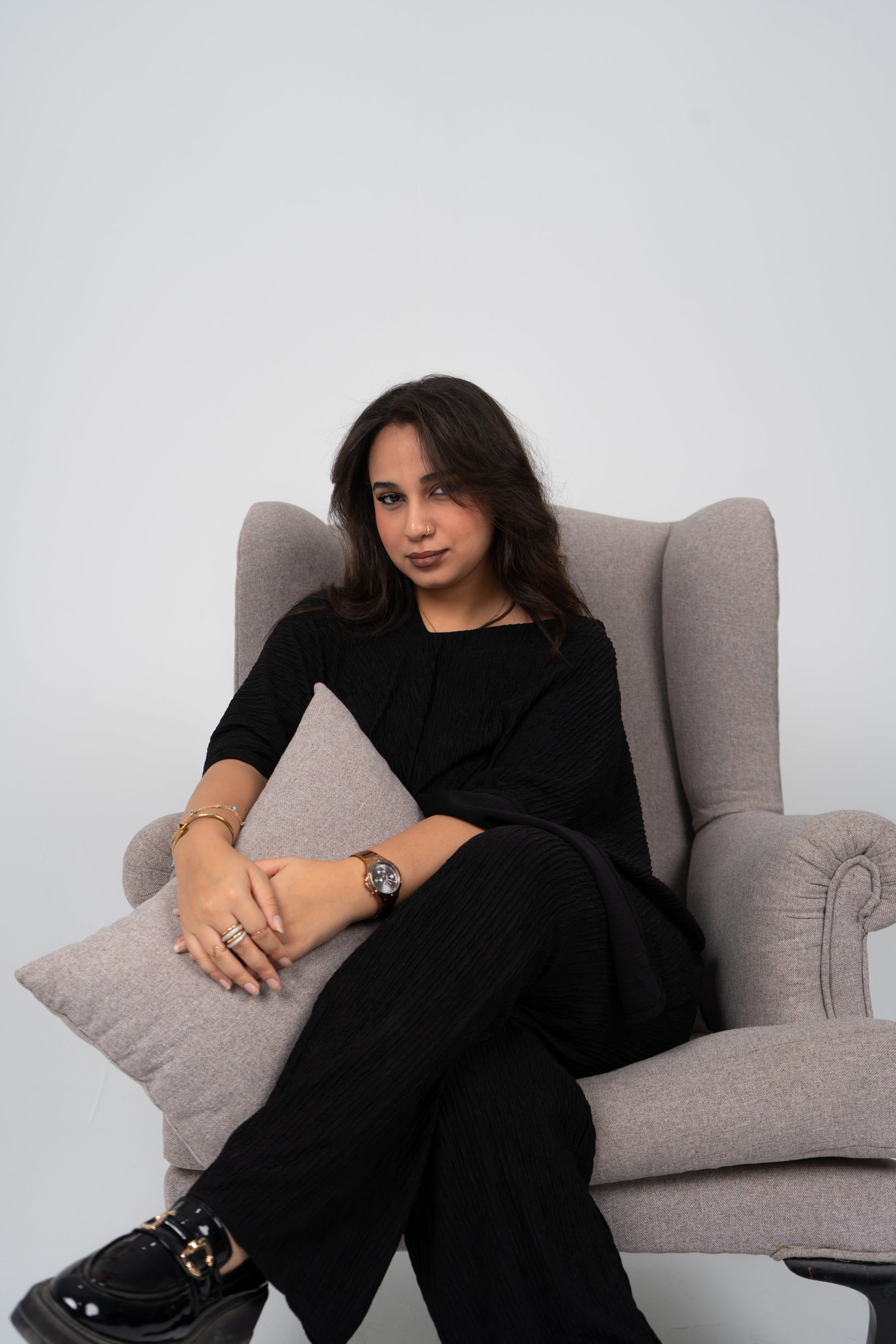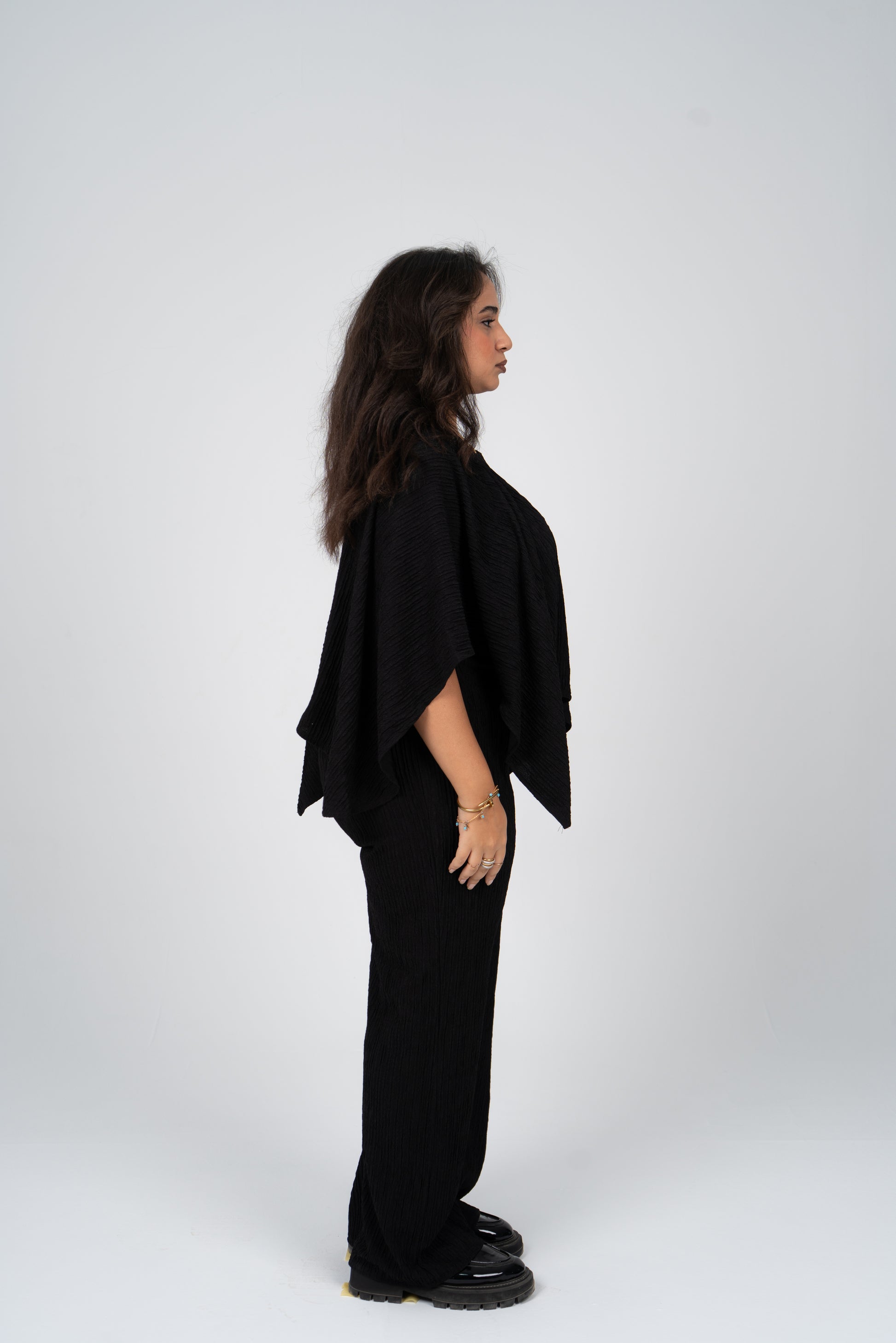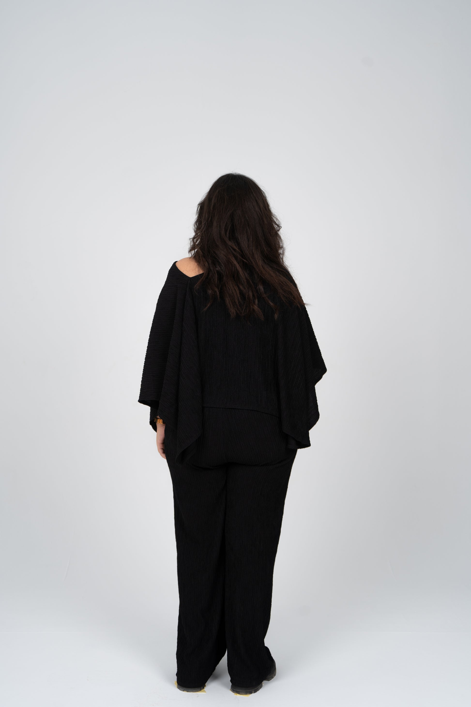 Elevate your everyday wear with our Ribbed Knit Lounge Set, designed for both comfort and understated luxury. Crafted from soft, textured ribbed fabric, this two-piece set features a relaxed-fit poncho-style top with an asymmetrical hem, paired with matching wide-leg pants that offer fluid movement and breathability.
