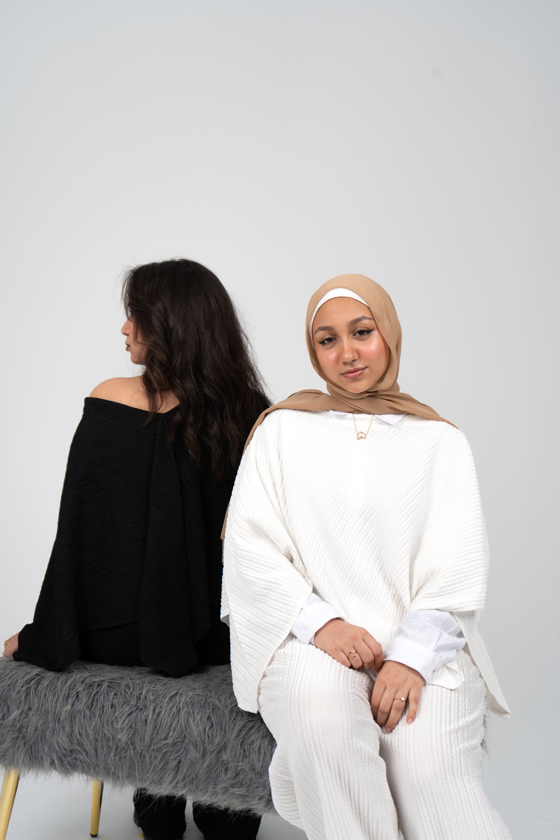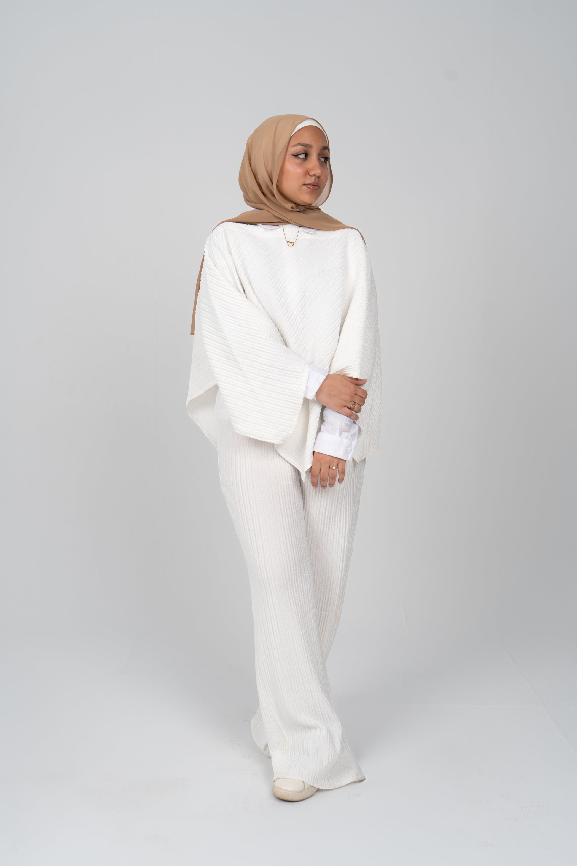 Elevate your everyday wear with our Ribbed Knit Lounge Set, designed for both comfort and understated luxury. Crafted from soft, textured ribbed fabric, this two-piece set features a relaxed-fit poncho-style top with an asymmetrical hem, paired with matching wide-leg pants that offer fluid movement and breathability.